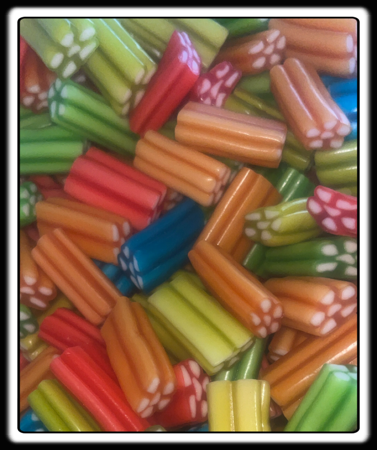 sucre, sirop de glucose-fructose, amidon, farine de blé (contient du gluten), sirop de sucre inverti, eau acidifiants: E330, amidon de pomme de terre, maltodextrine, humectant:E422, correcteur d'acidité:E332, graisse végétale (palme), gélatine de boeuf halal, arôme artificiel, colorants:E100, E129, E133.