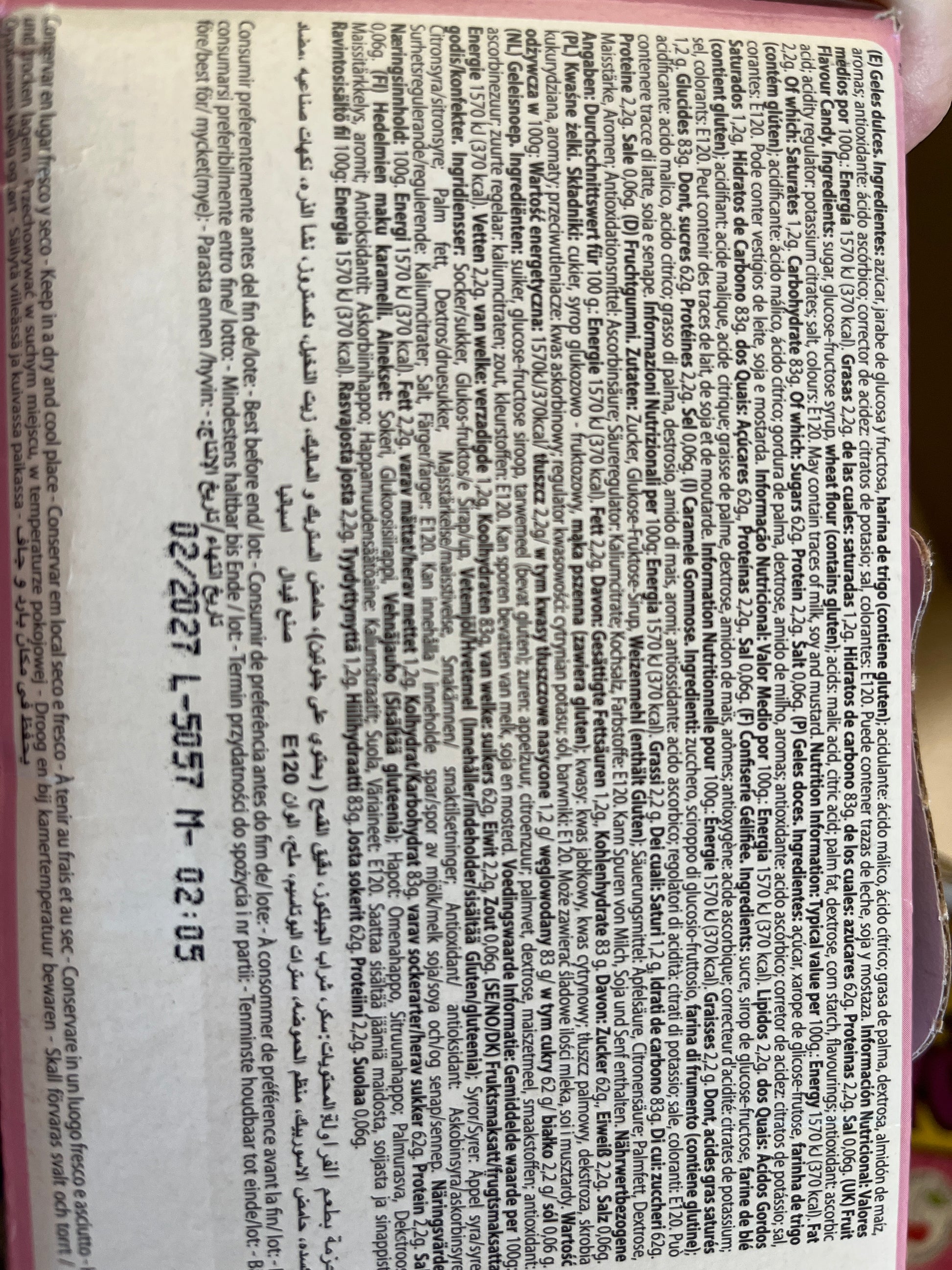 Sucre, sirop de glucose-fructose, amidon de maïs, sirop de sucre inverti, amidon de blé (contient du gluten), farine de blé, acidifiant: acide malique, acide citrique, graisse de palme, humectant: glycérol, arômes, correcteur d'acidité: citrates de potassium, sel, colorant: E120.