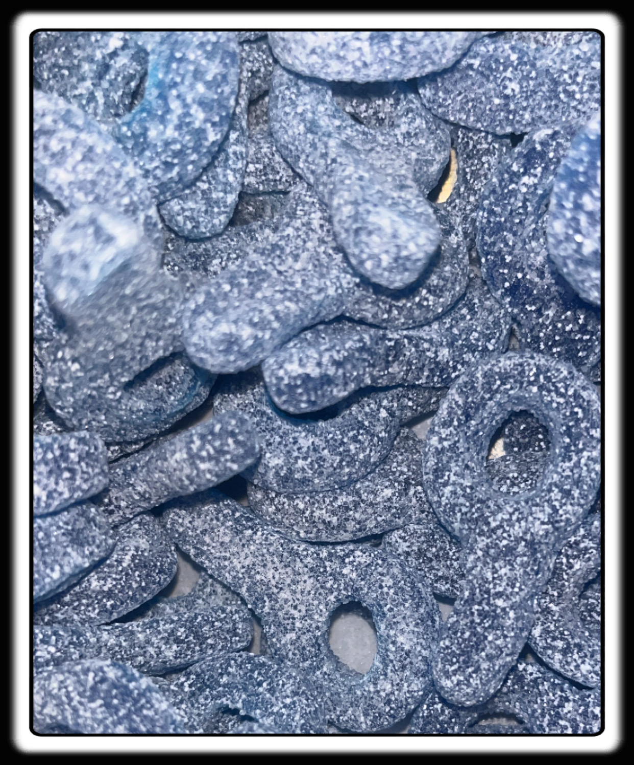 Gommes de fruits acidulées citriques (goût framboise) forme tétines bleues et qui colorent la langue ... en bleu.