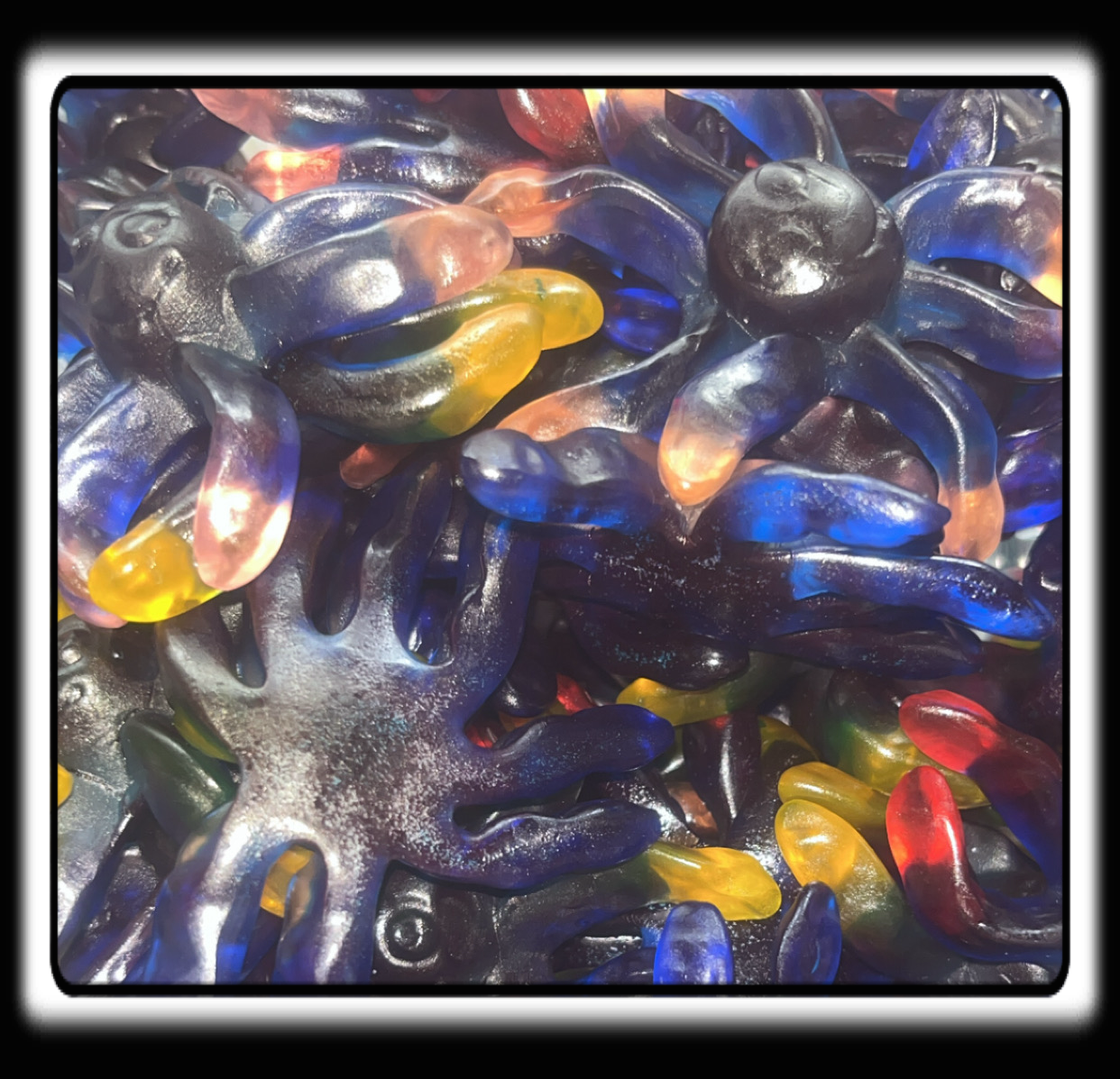 Sirop de glucose, sucre, gélatine, acidifiant : acide citrique, acide lactique,stabilisant : sorbitol, gélifiant : pectine, arômes, colorants : concentré de fruits et préparation d'extraits végétal (paprika), carmin, bleu patenté V, huile végétale, agent d'enrobage, cire d'abeille, cire de carnauba.